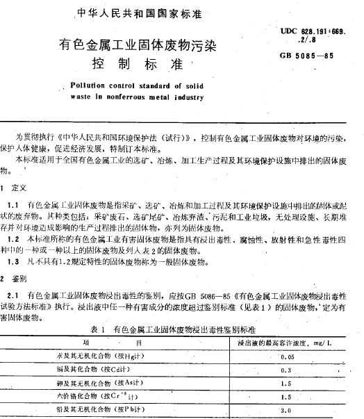 有色金屬工業固體廢棄物污染控制標準GB 5085-85