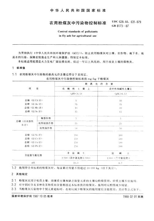 農用粉煤灰中污染物控制標準GB 8173-87