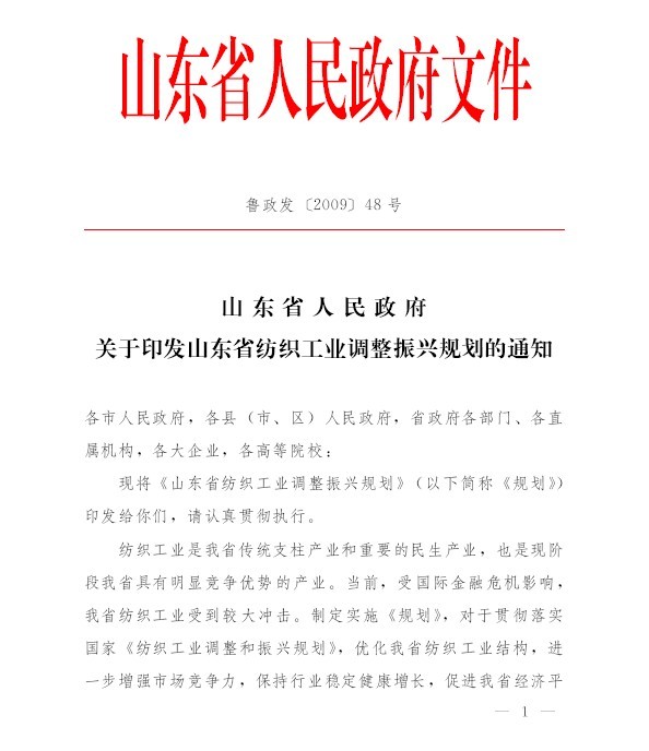 山東省紡織工業(yè)調(diào)整振興規(guī)劃 魯政發(fā)[2009]48號(hào)