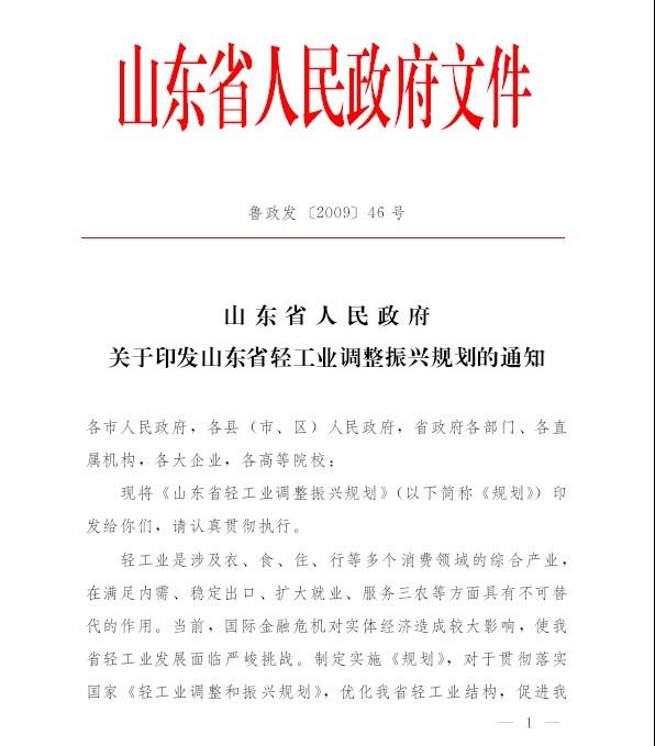 山東省輕工業調整振興規劃 魯政發[2009]46號