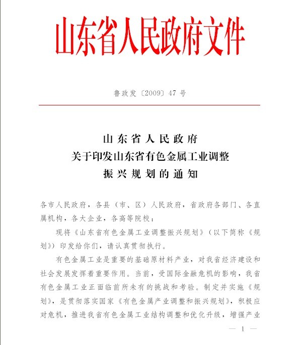 山東省有色金屬工業調整振興規劃 魯政發[2009]47號