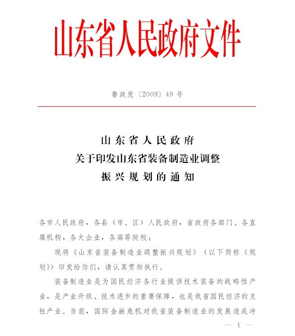 山東省裝備制造業調整振興規劃 魯政發[2009]49號