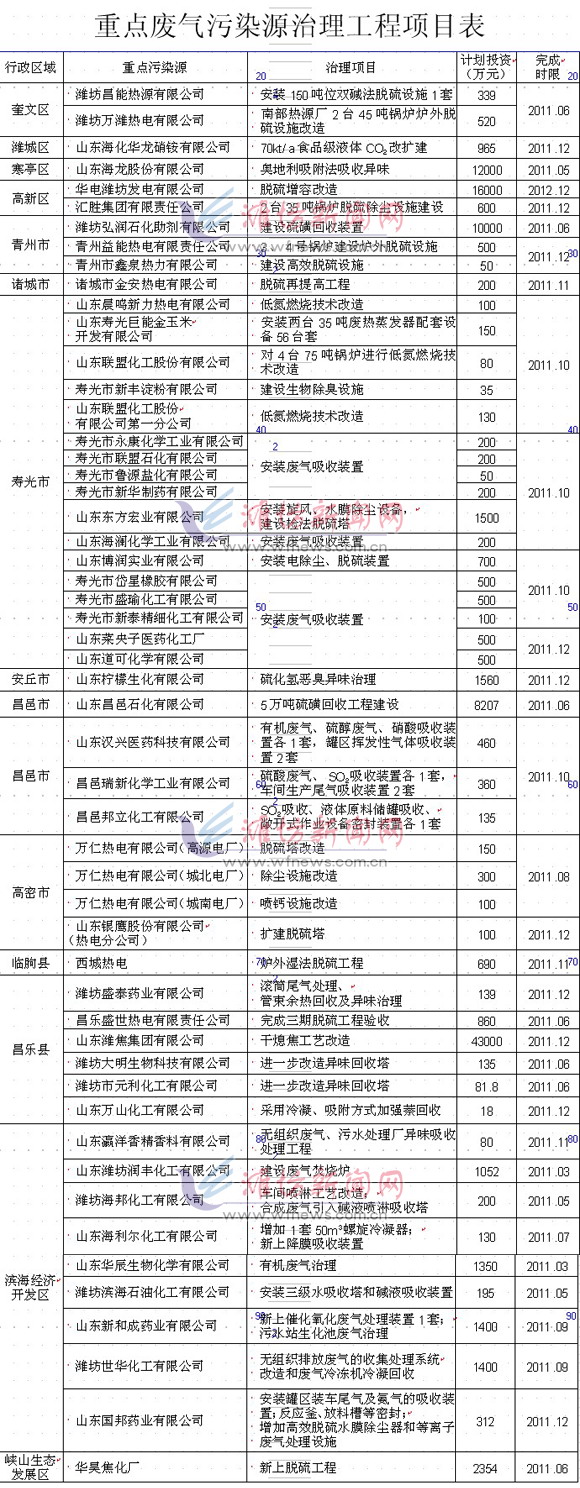 今年我市要對(duì)16個(gè)重點(diǎn)片區(qū)的53處重點(diǎn)污染源進(jìn)行治理。對(duì)每個(gè)重點(diǎn)污染源,都列出了治理重點(diǎn)和治理時(shí)限。奎文區(qū)的濰坊昌能熱源有限公司,要安裝150噸位雙堿法脫硫設(shè)施一套,今年6月份完工。濰城區(qū)的山東海化華龍硝銨有限公司,對(duì)70000噸/年食品級(jí)液體二氧化碳改擴(kuò)建,今年年底完成。寒亭區(qū)山東海龍股份有限公司,將利用奧地利吸附法吸收異味,今年5月份完工。高新區(qū)華電濰坊發(fā)電有限公司將進(jìn)行脫硫增容改建,匯勝集團(tuán)有限責(zé)任公司新上兩臺(tái)35噸位鍋爐脫硫除塵設(shè)施,今年年底完成。另外,青州、諸城、壽光、安丘、昌邑、高密、臨朐、昌樂、濱海經(jīng)濟(jì)開發(fā)區(qū)、峽山生態(tài)發(fā)展區(qū)等都有重點(diǎn)污染源治理項(xiàng)目。